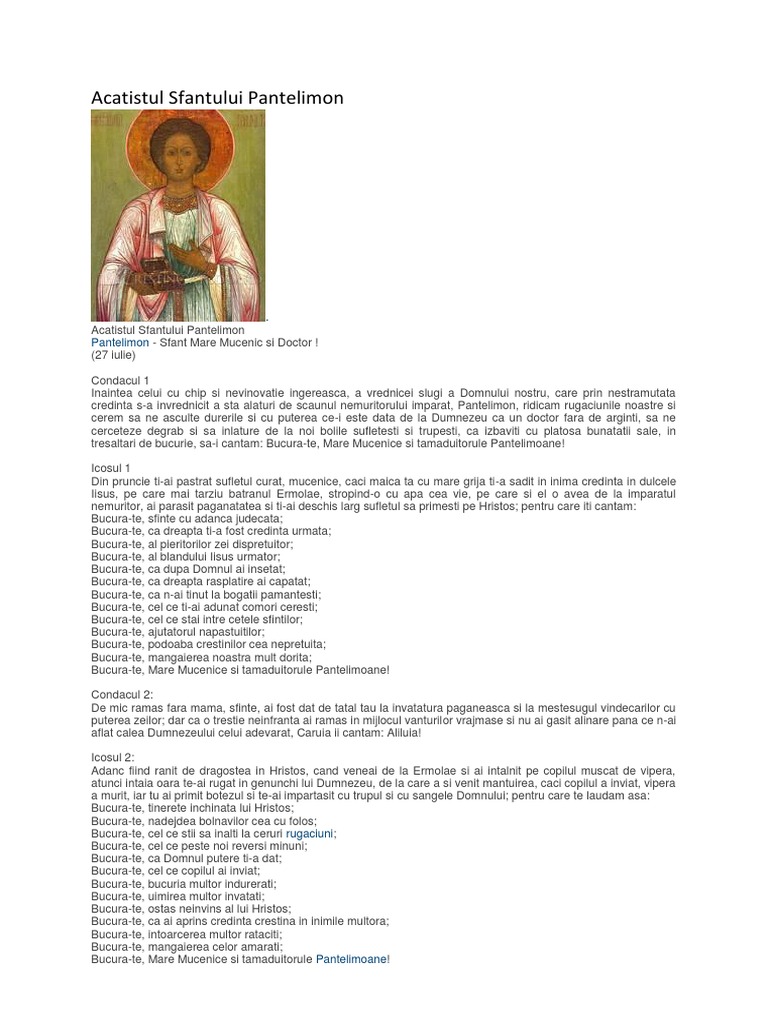 Acatistul sf pantelimon pdf. Troparul sfantului cuvios pahomie cel mare glasul al 5 lea. Inaintea celui cu chip si nevinovatie ingereasca a vrednicei slugi a domnului nostru care prin nestramutata credinta s a invrednicit a sta alaturi de scaunul nemuritorului imparat pantelimon ridicam rugaciunile noastre si cerem sa ne asculte durerile si cu puterea ce i este data de la. Si seara de seara erai in paraclisul sfantului lazar al leprozeriei unde se adunau bolnavii pentru pavecernita cu canonul. Pomenit in data de 27 iulie acest sfant este adesea numit doctor fara de arginti aratandu se prin aceasta cum ca el n a umblat dupa averi si s a multumit cu ceea ce putea avea din rosturile lui si nu cerea de la nimeni sa i plateasca pentru binefacerile.