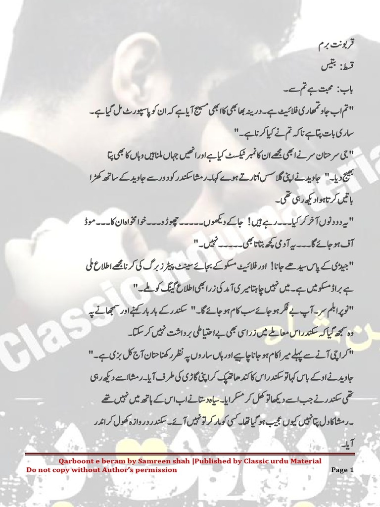 Samreen shah is a talented female story writer and top novelist of urdu who penned some excellent novels in a short period. Qarboonat baram by samreen surdu novelromantic 10 apk 407 mb 10 july 2018. People love to read romantic romance urdu novel forced marriage novel kidnapping based novel army based rude hero and heroin based hero teacher hero police hero doctor hidden nikah based university. Qarboont e bream by samreen shah online reading and download pdf qarboont e bream is a vary famous novel written by samreen shah qarboont e bream is a very well written complex script novel by samreen shah which depicts normal emotions and behaviour of human like love hate greed power and fear samreen shah is a very famous and popular specialy among female readers.